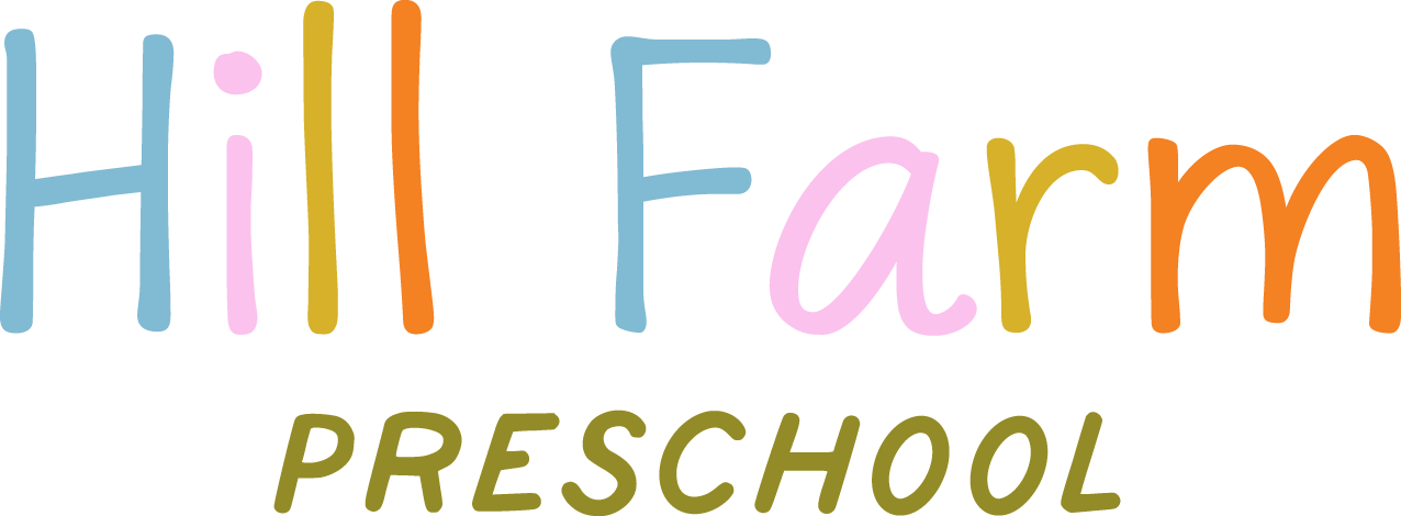 Drawing of a green hill with the words 'Hill Farm Preschool' written on it, two children standing on top, with a smiling sun in the sky.