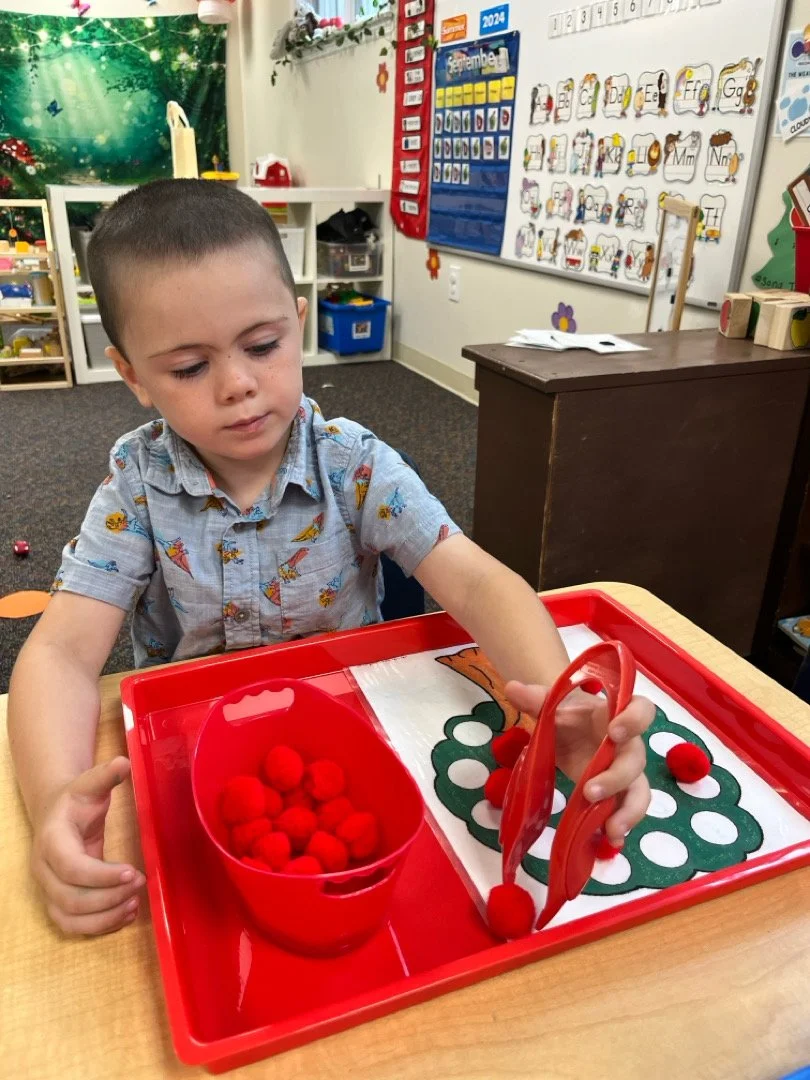 A young boy in a classroom preschool setting playing with red felt pom-poms and a Christmas tree craft on a tray.